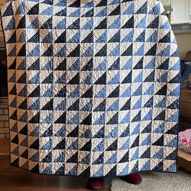 I made three quilts this year – one for me, one for my sister, and one for my mom. (Technically I made five if you count the two cat quilts I made, though my idiot cat couldn’t care less about the one I made him.) The one for my mom was important – I wanted it to be pretty and I wanted her to love it. So I bought a ton of fabric with a specific idea in mind, then realized after I cut seven thousand 5-inch squares that I wasn’t going to get the color effect I wanted and had to eliminate a ton of the fabric. I sewed a million HSTs and got most of the points to line up and even sent it to a longarmer rather than doing my janky straight line quilting. It turned out really beautifully and I am pretty pleased with myself for how well I did with so many goddamn points to line up. (On the plus side, I have enough fabric left over to make a quilt for me! Huzzah!)